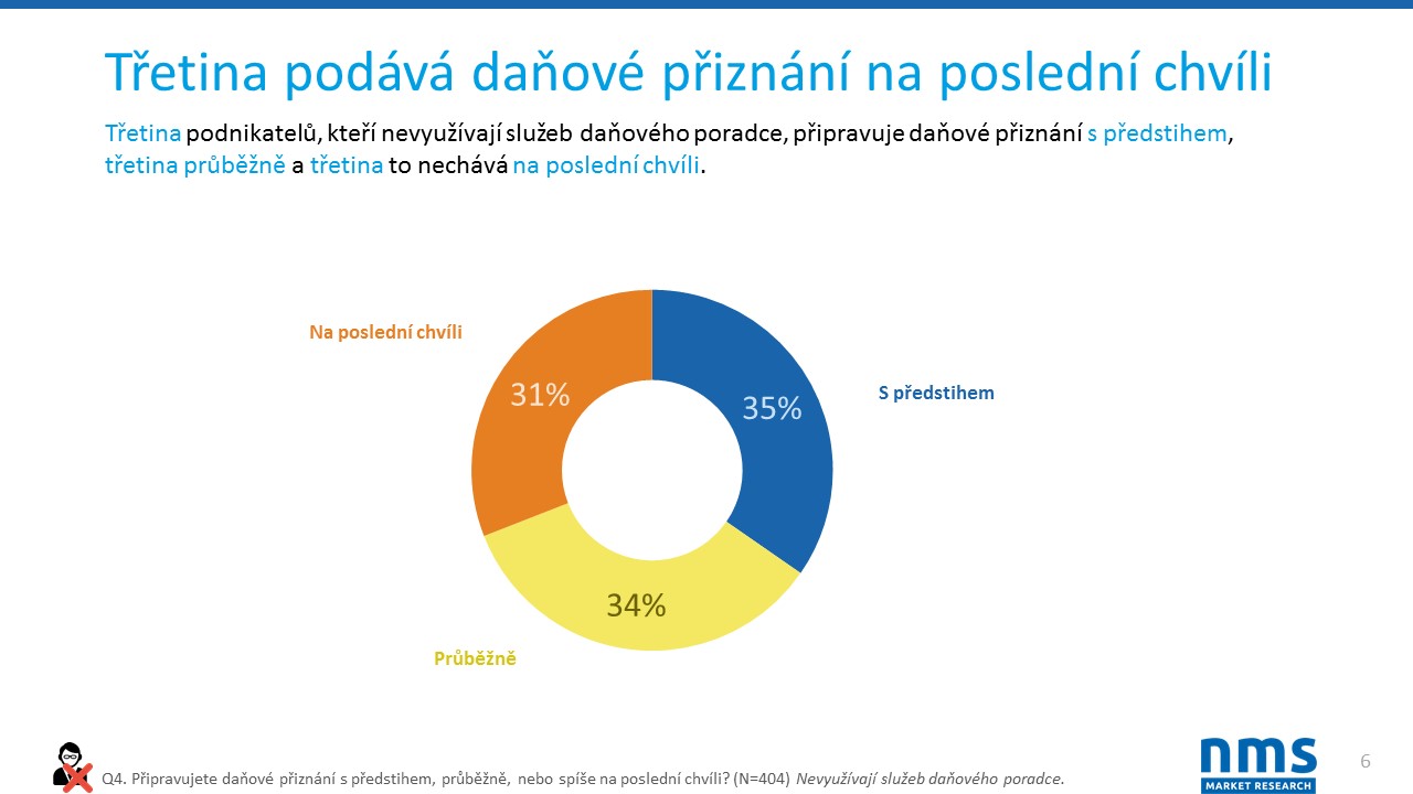 Téměř třetina tuzemských drobných podnikatelů nechává přípravu daňového přiznání na poslední chvíli a na vyplnění přiznání najímá daňového poradce. Za jeho služby běžně zaplatí kolem 2000 korun. Vyplývá to z únorového průzkumu NMS Market Research pro Raiffeisenbank mezi 600 živnostníky z celé ČR.